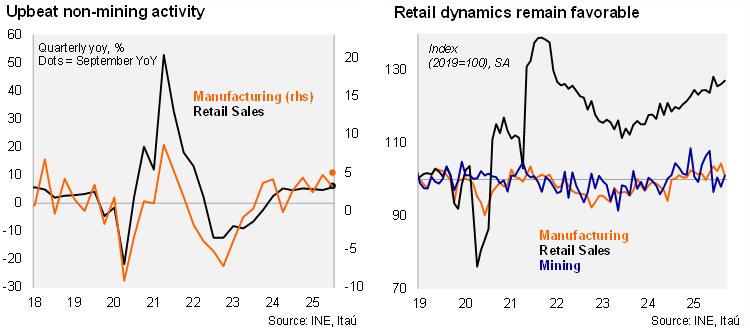 Real retail sales rose by 6.2% YoY (5.2% in August), above the Bloomberg market consensus (4.9%), but closer to our call 6.5%. Sequentially, retail sales increased by 0.8% MoM/SA. Retail dynamics have been boosted by new light motor vehicles, electronic, household and technological products. Manufacturing rose by 5.0% YoY (2% in August), below the Bloomberg market consensus of 7.4%, while closer to our call of 5.5%. Sequentially, manufacturing dropped 3.2% MoM/SA. Manufacturing was primarily pulled up by food processing (+13% YoY; 3.8pp contribution). Mining contracted for a fourth consecutive month (-1.8% YoY), despite some sequential recovery post the El Teniente event. Overall, industrial production posted a 1.5% YoY rise. Our IMACEC estimate for September, to be published on Monday, sits at 2.8% (EEE: 2.5%), with non-mining set to grow closer to 3.4%. The estimate is consistent with GDP growth of 1.7% in 3Q25, below the 2.5% estimate in the IPoM.