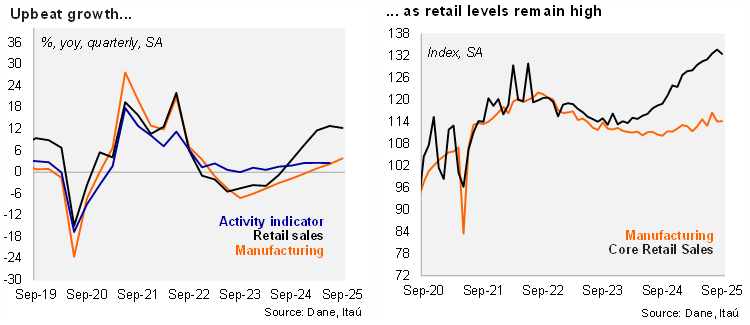 Strong activity dynamics at the margin. During the third quarter of the year, manufacturing increased 4.0% YoY (+0.6% rise in 2Q25). At the margin, manufacturing increased 5.3% qoq/saar (up from 3.6% in 2Q25). Moreover, retail sales rose 15.2% YoY in 3Q25 (+12.0% in 2Q25), with core retail sales up by 12.9% YoY in 3Q25 (+12.6% in 2Q25). Sequentially, core retail sales growth increased to 8.2% qoq/saar (from +9.0% in 2Q25). Within the quarter durable good sales led the outcome with computers, vehicle, and home appliances sales expanding at a superlative pace of 52.4% YoY, 34.4% YoY and 23,9% YoY each.