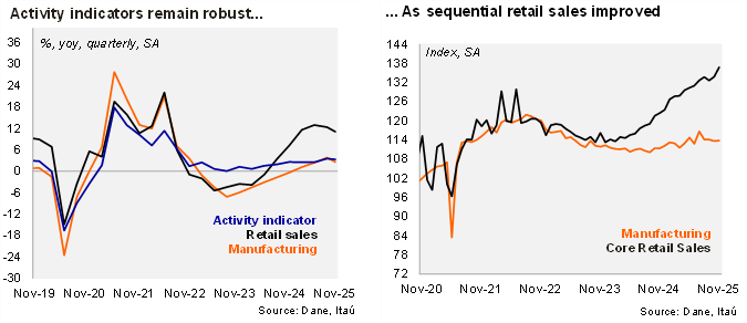Despite the slower pace, retail sales continue to expand at the margin. During the quarter ending in November, manufacturing increased by 2.5% YoY (+4.1% rise in 3Q25). At the margin, manufacturing dropped 2.4% QoQ/saar (down from +5.3% in 3Q25). Retail sales rose 10.4% YoY in the quarter ending November (+15.2% in 3Q25), while core retail sales increased 11.1% YoY (+12.9% in 3Q25), driven by IT equipment and vehicle sales. Sequentially, core retail sales increased 6.0% QoQ/saar (from +8.5% QoQ/saar in 3Q25).