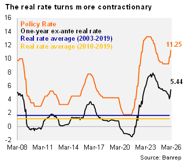 Our take: Inflation risks remain clearly skewed to the upside, reflecting persistent indexation, uncertainty around the minimum wage hike, high global oil prices, and rising El Niño risks in 2H26 through food prices. Despite softening growth, inflation expectations remain unanchored, reinforcing the case for a restrictive stance. While institutional frictions complicate the outlook, we continue to expect further tightening at the April 30 meeting, contingent on quorum. Markets are likely to increasingly price credibility and governance risks alongside traditional inflation‑growth dynamics to macroeconomic variables.