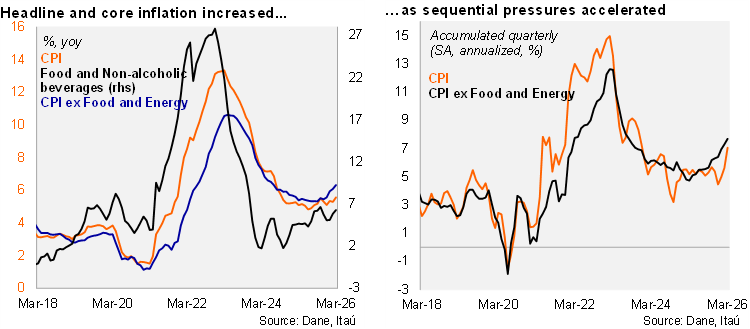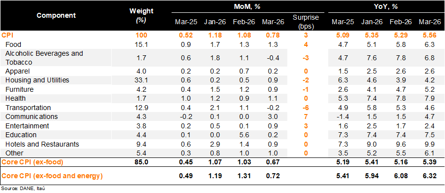 Headline and core inflation rebounded in March, surprising the market to the upside. Consumer prices rose by 0.78% MoM (+1.08% in February), above the Bloomberg market consensus of 0.69%, while closer to our 0.75% call. The main positive contributors in the month were housing and utilities (+0.85% MoM; +26bps), food (+1.27% MoM; +24bps) and hotels and restaurants (+0.89% MoM; +10bps). Consumer prices excluding food rose by 0.67% MoM (+0.45% one year earlier), while inflation excluding food and energy increased by 0.72% MoM (+0.49% MoM one year earlier). On an annual basis, headline inflation increased by 27bps from February to 5.56%, while core inflation increased by 24bps to 6.32%, the highest level since July 2024. Services inflation continued to rise, moving well above 7% year over year.