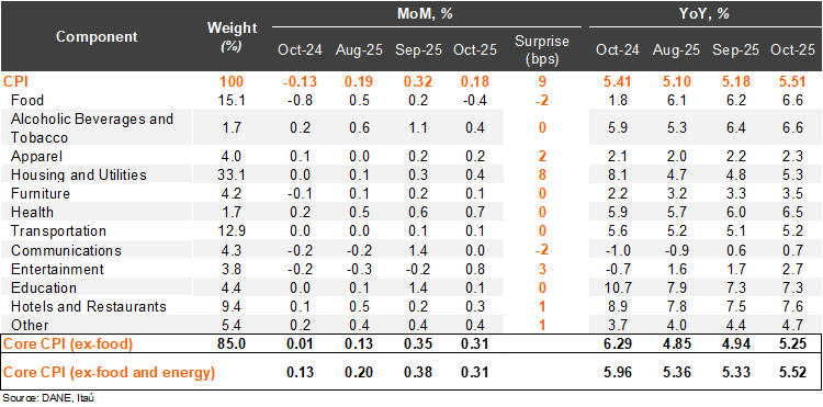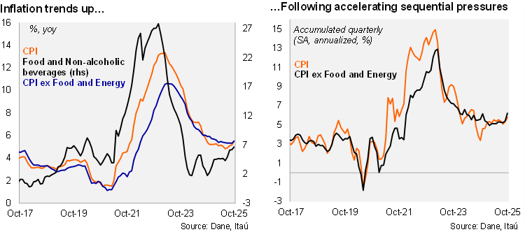 Annual core and headline inflation rebounded again, surprising the market consensus to the upside. Consumer prices rose by 0.18% MoM in October, above the Bloomberg market consensus of 0.14% and our 0.09% call. The main positive contributors in the month were housing and utilities (+0.41%; +13bps), hotels and restaurants (+0.27%; +3bps) and entertainment (+0.8%; +3bps). Meanwhile, food prices dropped 0.35%, subtracting 7bps. Housing and utilities explained most of the upside surprise relative to our forecast (particularly water supply and sewage). Consumer prices excluding food rose by 0.31% MoM (+0.01% one year earlier), while inflation excluding food and energy rose by 0.31% MoM (+0.13% one year ago). On an annual basis, headline inflation increased by 33bps from September to 5.51% in October, while core inflation increased by 19bps to 5.5%. Year-to-date inflation sits at 4.7% (4.4% by October 2024), well above the ceiling of the tolerance range around the central bank’s 3% target.