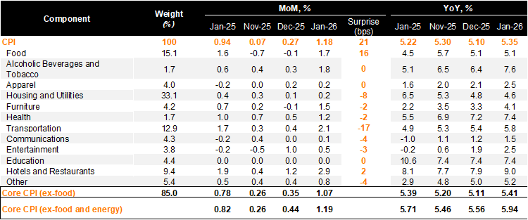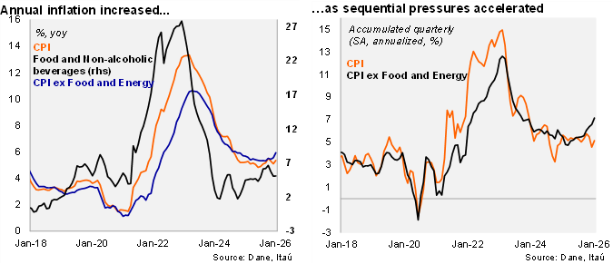 Annual core and headline inflation rebounded again. Consumer prices rose by 1.18% MoM in January (0.94% one year ago), broadly in line with the Bloomberg median of 1.21%, but well below our 1.39% call. The main positive contributors in the month were hotels and restaurants (+2.94%; +33bps), food prices (+1.66%; +31bps), and transport (+2.14%; +29bps). Transport and housing prices explained most of the surprise relative to our forecast. Consumer prices excluding food rose by 1.07% (+0.78% one year earlier), while inflation excluding food and energy increased by 1.19% MoM (+0.82% one year ago). On an annual basis, headline inflation increased by 25bps from December to 5.35%, the highest since October 2025, while core inflation increased by 38bps to 5.94%, the highest since November 2024.