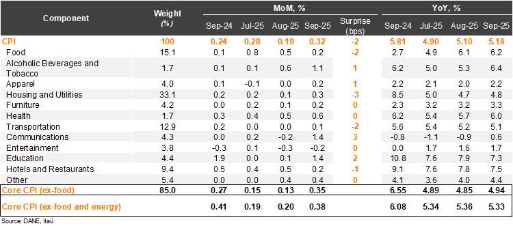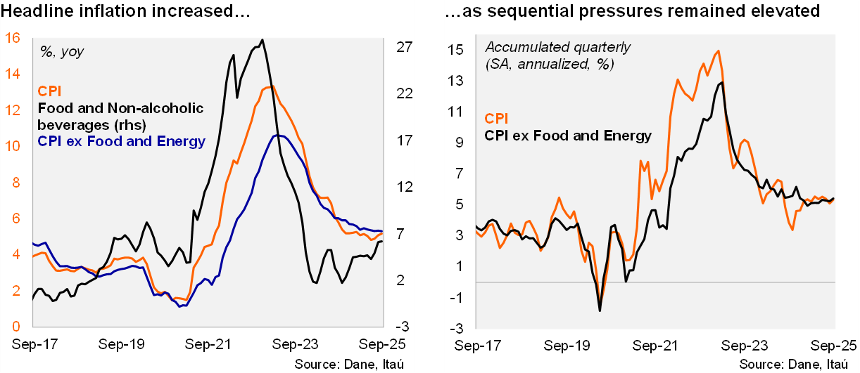 Annual inflation rebounded for the third consecutive month, surprising consensus to the upside. Consumer prices rose by 0.32% MoM in September, above the Bloomberg market consensus of 0.26%, but closer to our 0.34% call. The main positive contributors in the month were housing and utilities (+0.31%; +10bps), beverages and tobacco (+1.1%; +7bps) and education (+1.4%, +6bps). Meanwhile, food prices rose a mild 0.18%, contributing 3bps. Consumer prices excluding food rose by 0.35% MoM (+0.27% one year earlier), while inflation excluding food and energy rose by 0.38% MoM (+0.41% one year ago). On an annual basis, headline inflation increased by 8bps from August to 5.18% in September, while core inflation fell mildly by 3bps to 5.33%. Cumulative inflation in the year through September rose to 4.5% (unchanged from 2024), already above the ceiling of the tolerance range around the central bank’s 3% target.