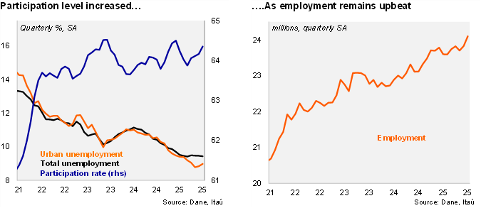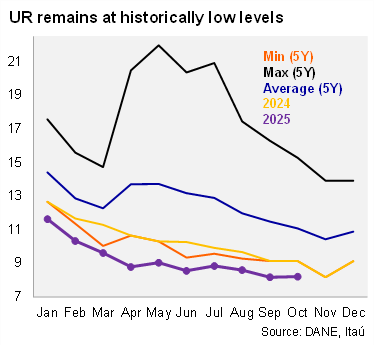 Our take: The positive trend observed throughout the year continued in October. We foresee an average unemployment rate of 9.0% for 2025, compared to 10.2% in 2024. With a robust labor market, persistent inflation, and fiscal imbalances, BanRep will likely remain on hold for an extended period.