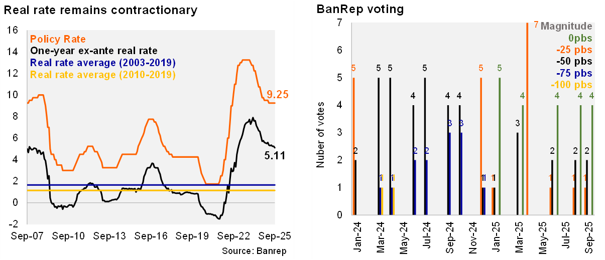 A majority of the BanRep Board held the policy rate at 9.25%, marking the third consecutive pause. The decision was in line with the Bloomberg market consensus and our call. The split decision saw four members voting for hold, one member favoring a 25bp cut, and two members supporting a larger 50bp cut (Finance Minister included). The one-year ex-ante real reaches 5.11% (using the monthly analyst survey), above BanRep’s real neutral rate estimate of 2.7% in 2025 (3.1% in 2026). Governor Villar emphasized that most members are maintaining a cautious stance, acknowledging the risks associated with inflation converging to the target. Nevertheless, he emphasized that the Board's discussion has centered between holding and lowering the policy rate, yet the downward disinflation trend is less clear than before. Villar stated that an interest rate hike has not yet been considered a plausible option given the contractionary levels of monetary policy.