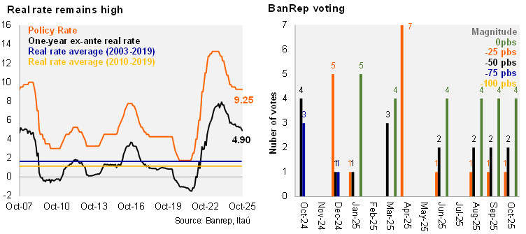As widely expected, BanRep Board held the policy rate at 9.25%, marking the fourth consecutive pause. The split decision saw four members voting for hold, one member favoring a 25bp cut, and two members supporting a larger 50bp cut, the same breakdown as in the last three meetings. The one-year ex-ante real reaches 4.90% (using the monthly analysts survey), above BanRep’s real neutral estimate of 2.7% in 2025 (3.1% in 2026). Governor Villar emphasized that among the key arguments for the decision were inflation dynamics with September’s CPI increasing again for the third consecutive month, reaching 5.2%, while the core metric remained stable at 4.8%. On the other hand, inflation expectations at the two-year policy horizon continue to stand above the 3% target. On the economic front, domestic demand maintains strong momentum, reflected in a widening trade deficit. Finally, external financial conditions are less tight due to the Fed’s rate cuts. Villar emphasized that upcoming decisions will depend on the evolution of inflation and expectations, the dynamics of economic activity, and the balance of internal and external risks.