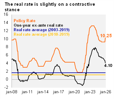 Activity was revised up for 2025, and down for 2026. Governor Villar highlighted that recent macroeconomic indicators suggest that economic activity continues to show solid momentum, leading the technical staff to expect that the economy grew 2.9% in 2025 (up from the previously expected 2.6%). However, the 2026 growth was revised down to 2.6% (2.9% in the last monetary policy report). For its part, the current account deficit is widening and is expected to reach 2.4% of GDP in 2025, compared with 1.6% observed in 2024. This is explained by a significant increase in imports driven by domestic demand, along with a decline in mining‑energy exports.