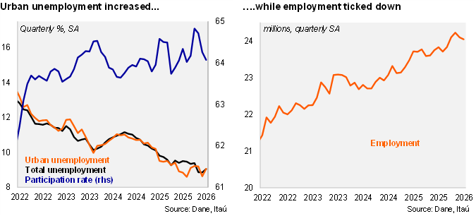 Labor market remains tight as effects of minimum wage adjustment still to materialize. According to DANE’s labor report for January, the national unemployment rate fell to 10.9%, a decrease of 0.8pp year on year. Meanwhile, the urban unemployment rate fell to 10.6%, a drop of 0.5pp year on year (Bloomberg market consensus and our 10.3% call). Employment increased by 1.3% YoY in January (+3.8% YoY in December), while the labor force rose by 0.8% YoY (+2.4% YoY in the previous month). The participation rate fell to 65.3% (+65.7% one year ago). Sequentially, employment fell by 0.2% (-0.5% in the previous month), while the unemployment rate (SA) sits at 8.5% (8.4% in January 2025). Meanwhile, the urban unemployment rate (SA) increased to 8.6% (from 8.1% in the previous month), which is below BanRep’s NAIRU of 9.7%.
