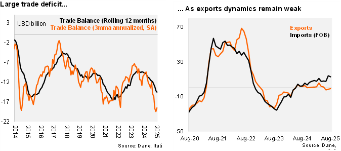 The weak export trend persisted in August. Exports fell by 0.1% YoY (-4.1% in July). Coffee exports remained positive, growing by 71.3% YoY (70.3% in July) boosted by a favorable price effect. Meanwhile, energy exports continued to plummet, with coal exports contracting 36.3% (down from -45.8% the previous month and -35% on the YTD) and oil exports declining by 25.8% YoY (down from -17.1% in July and -16.8% on the YTD) due to both lower prices and volumes. In contrast, non-traditional exports posted a solid 14.2% year-on-year expansion (12.5% in July). In the quarter ending in August, exports fell 0.8% YoY (-2.2% in 2Q25). At the margin, exports contracted 11.8% QoQ/saar (-12.7% in July). As of August, exports to the US accounted for 30.3% of the total.