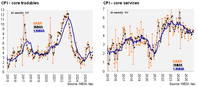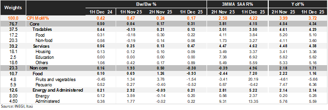 According to INEGI, first-half CPI for December posted a 2w/2w increase of 0.17%, below both Bloomberg’s market consensus (0.32%) and our estimate (0.39%). Similarly, the Core CPI registered 0.31%, also underperforming market expectations (0.41%) and our call (0.40%). Within the core component, tradables rose 0.13% 2w/2w, with the food subcomponent showing the largest increase (+0.22%). Meanwhile, goods excluding food came in slightly lower than our previous estimate (0.06% vs. 0.17%), consistent with expectations of no payback. On the services side, prices advanced 0.47% 2w/2w, with Others category posting the highest increase (0.89%). In contrast, the non-core CPI recorded a 0.3% contraction, driven mainly by food prices (-0.93%).