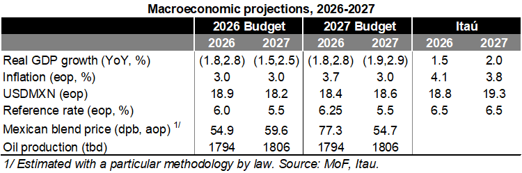 For 2027, the fiscal consolidation path remains broadly unchanged relative to prior guidance. The fiscal balance is projected at -3.5% of GDP, alongside a higher primary surplus of 1.1% of GDP (from 0.8%). However, the debt ratio is now expected to rise further to 55.0% of GDP (from 52.3%), pointing to a slower stabilization trajectory. The document also includes a preliminary list of priority spending programs for the upcoming budget, emphasizing social programs, migration-related services, multilateral engagement, R&D, and targeted support for women and indigenous communities. Official 2027 GDP growth is projected at a range between 1.9-2.9%; we forecast 2.0% and Banxico’s analyst survey median is at 1.82%.