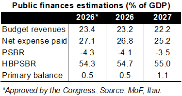 The Ministry of Finance (MoF) released the Preliminary Economic Policy Guidelines, updating the 2026 fiscal outlook and providing initial guidance for the 2027 Budget to be presented in September. The updated 2026 fiscal deficit projections show a modest improvement relative to the approved budget. The headline and primary balances are now estimated at -4.1% of GDP (from -4.3%) and 0.5% of GDP (unchanged), respectively. The narrower headline deficit reflects lower expenditures—primarily due to reduced allocations for Pemex debt amortization and a decline in interest costs (26.8% of GDP, down from 27.1%). Revenues were revised slightly lower to 23.2% of GDP (from 23.4%), driven by weaker Pemex-related income and the impact of gasoline subsidies. Meanwhile, the Historical Balance of Public Sector Borrowing Requirements (HBPSBR) was revised up to 54.7% of GDP (from 54.3%), largely reflecting INEGI’s upward revision to nominal GDP. Official 2026 GDP growth is foreseen at a range between 1.8-2.8%, above our call of 1.5% and Banxico’s analyst survey median (1.49%).