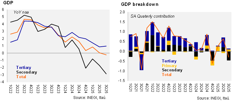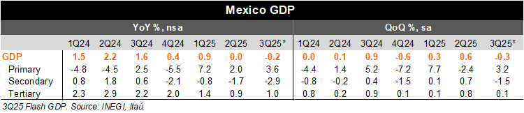 The 3Q25 flash GDP fell by 0.2% YoY, slightly better than Bloomberg’s market consensus and our forecast, both of which were at -0.3% YoY. On an annual basis, primary activities increased by 3.6%, industry declined by 2.9%, and services grew by 1.0%. As of 3Q25, GDP rose by 0.2% due to growth in primary and tertiary activities, with the industry being the main drag. Using seasonally adjusted figures, GDP contracted by 0.3% QoQ (Bloomberg -0.4%, Itaú -0.2%) due to the industry's performance at -1.5%, despite increases in both services (+0.1%) and agriculture (+3.2%). With these seasonally adjusted results, GDP grew by 0.5% annually in the first nine months of the year.