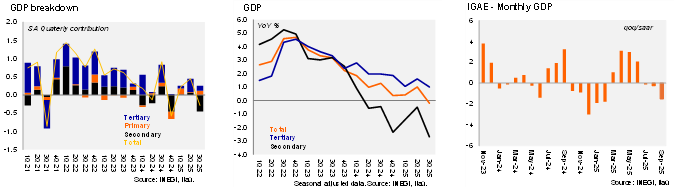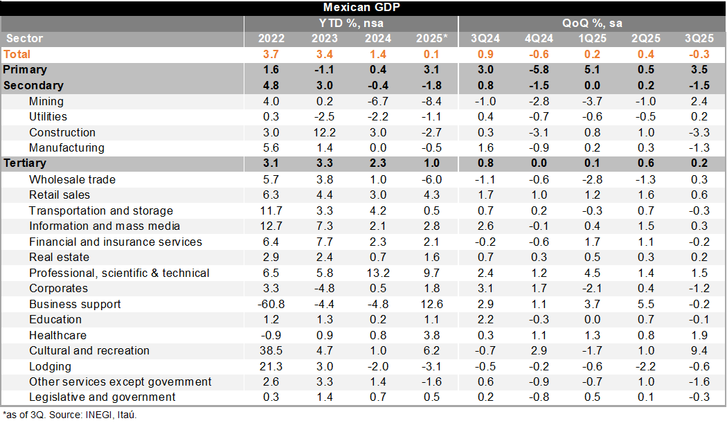 The final 3Q25 GDP fell by 0.1% YoY, a smaller contraction than expectations and the flash estimate, both of which were at -0.2%. Primary activities increased by 3.7% YoY (preliminary: +3.6%), industry decreased by 2.7% YoY (preliminary: -2.9%), and services grew by 1.1% YoY (preliminary: +1.0%). Using seasonally adjusted data, GDP fell by 0.3% QoQ, in line with the consensus forecast and slightly better than our call (-0.4%). Primary activities and services were the main drivers, at 3.5% and 0.3%, respectively, while industry decreased by 1.5%. In the first nine months of the year, the economy grew by 0.4% YoY on a seasonally adjusted basis, mainly due to the primary and tertiary sectors, despite a contraction in industry.