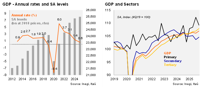 According to INEGI, the first estimate of Mexico’s GDP for the fourth quarter of 2025 showed an annual growth rate of 1.6%, above Bloomberg market expectations of 1.3%. Sequentially, activity expanded by 0.8% quarter-on-quarter SA, also above the market median of 0.6%. As a result, economic activity in 2025 would have closed with an overall growth of 0.6%, above our forecast of 0.3%, though still well below Mexico’s estimated potential growth. The Carry-over effect for 2026 sits now at 0.57%. Across sectors, all components recorded positive annual growth. Agriculture posted a robust 6% year-on-year expansion, while secondary activities grew by 0.3% and tertiary activities by 2%.
