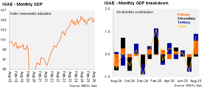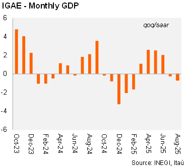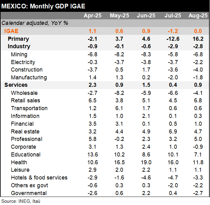 Economic activity fell by 0.9% YoY in August, which was between Bloomberg’s market consensus of -0.5% and our forecast of -1.9%. After adjusting for calendar effects, activity remained unchanged. This was due to the negative performance of industry (-2.8%, marking six consecutive annual decreases with a broad-based decline across subsectors during the month), and growth in services (+0.9%, with nine out of 14 subsectors showing growth) and agriculture (+16.2%, following a 12.6% contraction in July).