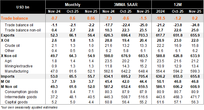 November’s trade balance revealed a goods surplus of USD 662.8 million, exceeding Bloomberg’s market consensus of a USD 451.5 mm deficit and improving upon November 2024’s deficit of USD 706.2 mm. On a 12-month rolling basis, the goods trade balance improved to a surplus of USD 189.9 mm, from a USD 1.2 bn deficit in October. However, at the margin, using three-month annualized seasonally adjusted figures, the trade balance showed some deterioration, now indicating a deficit of USD 1.5 bn (down from a USD 600 mm deficit in October). Worth mentioning that this is due a weak base effect from the September’s data. Examining the breakdown on a 12-month rolling basis, the oil trade balance continued to show a deficit (USD 24.8 bn deficit compared to a USD 25.0 bn surplus for non-oil), following the decline in domestic oil production and the government's strategy to prioritize domestic oil refineries. Manufacturing exports continue to be the highlight of the year, while capital goods imports are losing strength at the margin, leaving investments adjustments yet to materialize.
