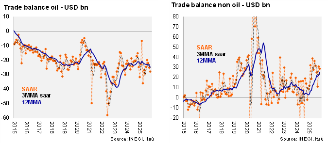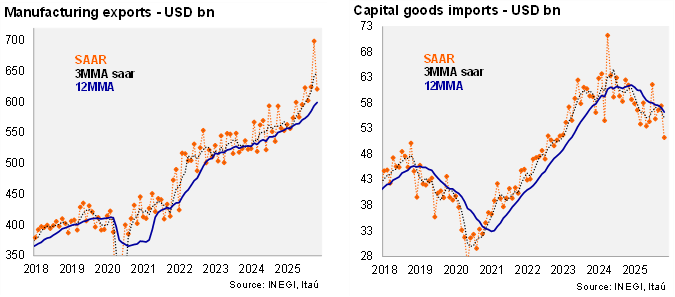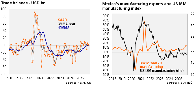 Our view: The better-than-expected trade balance in November follows a series of strong external data. Today’s release showed exports increasing at the margin, especially in the non-auto manufacturing sector, although there was some correction from the very strong numbers in October. Net exports are an important driver of economic growth in 4Q25, though less so than in 1Q25. Uncertainty surrounding Mexico’s trade relationship with the US will continue to challenge trade flows until a definitive USMCA renegotiation begins before July 1, 2026. Looking ahead, oil exports will be influenced by domestic policies related to national sovereignty and oil price dynamics, while manufacturing exports are expected to remain at high levels.