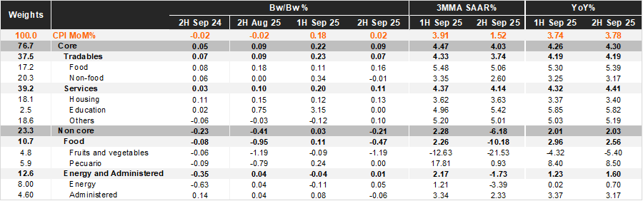 Bi-weekly headline CPI for the second half of September rose by 0.02%, below Bloomberg’s market consensus and our forecast, both at 0.08%. Core inflation came in at 0.09%, in line with our forecast but slightly below the market's expectations of 0.10%. Within the core component, tradable prices rose by 0.07% 2w/2w, down from the previous fortnight's 0.23%, due to food merchandise prices, despite deflation in non-food prices. Services inflation increased by 0.11% 2w/2w, down from the previous data of 0.20%, driven by housing and other services. The non-core component decreased by 0.21% 2w/2w due to deflation in the agricultural and tariffs components, which fell by 1.19% and 0.06% during the fortnight, respectively.