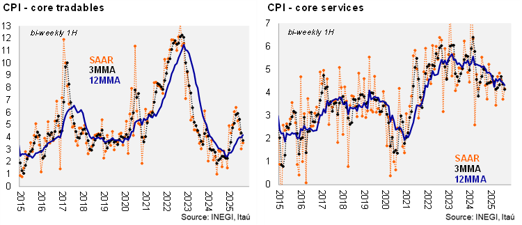 In annual terms, headline inflation rose to 3.76% in September, remaining below the 4% threshold since the second half of April, mainly supported by non-core inflation. Core CPI was relatively stable, moving slightly to 4.28%, with tradables at 4.19% (up from 4.05%) and services at 4.36% (down from 4.40%). We continued to observe significant marginal relief in core inflation: core CPI is at 3.9% 3MMA SAAR, with tradables at 3.6% and services at 4.0%. Within services, the pressure came from education due to the 2025-2026 school year, which represents a shift from the traditional August start.