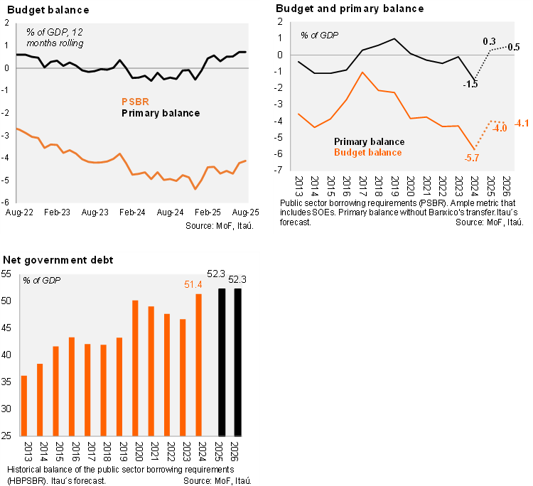 Our view: August’s figures indicate that the pace of revenue improvement continues to slow. Expenditures declined, reaching 94.9% of the budget as of August, primarily due to cuts in public investment. For 2025, we anticipate fiscal consolidation with a nominal deficit of 4.0% of GDP, a rising net government debt of 52.3%, and a primary surplus of 0.3%, in a context of lower interest payments compared to the previous year. Despite the measures included in the 2026 budget to increase revenues, such as increased use of technology in customs and higher taxes on products from countries without a trade agreement with Mexico, we believe additional revenue-enhancing measures may be needed in the future. We also remain cautious regarding the sustainability of continuing transfers to Pemex to meet its increasing market debt and bank loans obligations.