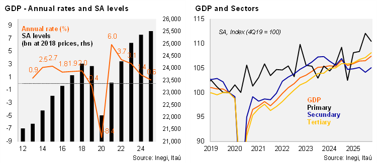 Our take: In our view, the National Accounts data reflect somewhat stronger momentum at the margin for the Mexican economy, particularly considering that both secondary and tertiary activities posted positive rates. This is a key pillar for the outlook of a gradual activity recovery. However, uncertainty related to the USMCA renegotiation, the recent surge in narco‑related violence threatening potential gains from the FIFA World Cup, and still‑weak investment prospects (given that the recently announced investment plan still lacks crucial details to gauge its impact) are all factors that could hinder the recovery.