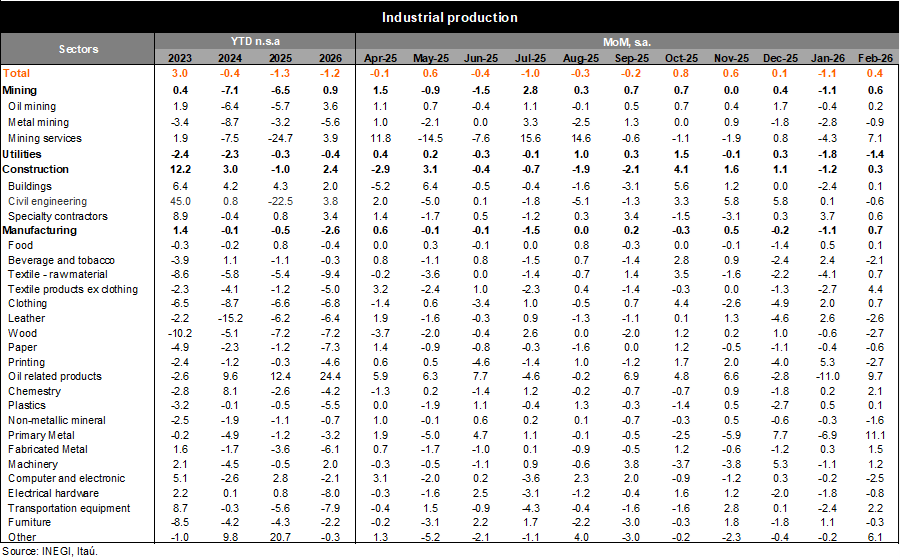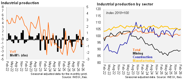 Industrial production (IP) decreased by 1.3% YoY in February, slightly below Bloomberg’s market consensus of -1.0% but in line with our call. The decline was driven primarily by manufacturing (-2.2% YoY), where 18 out of 21 subsectors contracted. In contrast, mining (+1.1% YoY) and construction (+0.8% YoY) provided modest offsets. Using seasonally adjusted figures, IP increased by 0.4% MoM, underperforming market expectations of 0.6% growth but exceeding INEGI’s nowcast of flat growth. The monthly increase was supported by expansions in mining (0.6% MoM, especially in mining services, following a weak performance since mid-2025), construction by 0.3% (with growth in buildings and specialty contractors, despite contraction in civil engineering), manufacturing by 0.7% (as 12 out of 21 subsectors increased). However, utilities declined by 1.4% MoM, marking a second consecutive monthly contraction and continuing to weigh on industry.
