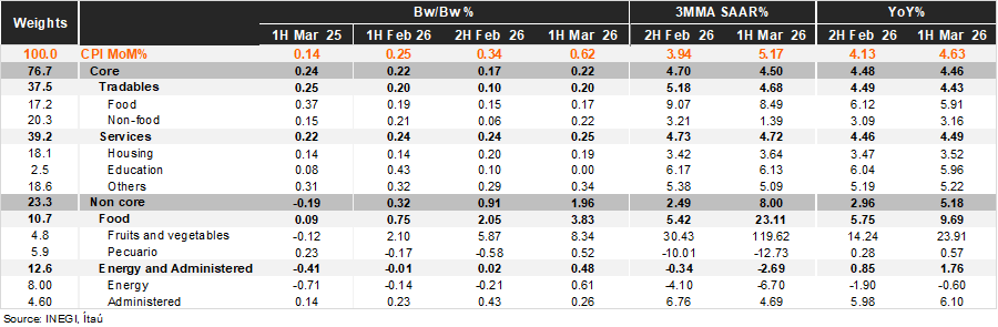 Bi-weekly headline CPI for the first half of March was 0.62%, well above the Bloomberg median of 0.40% and our estimate of 0.42%. In contrast, core CPI rose by 0.22%, in line with market expectations and below our estimate of 0.27%. Within the core component, tradables rose 0.20% bi-weekly, with the food subcomponent rising 0.17% and non-food increasing 0.22%. Meanwhile, core services advanced 0.25% bi-weekly, with housing and other categories increasing by 0.19% and 0.34%, respectively. Non-core CPI recorded a 1.96% rise, the highest inflation since the first half of July 2024, driven by food prices in products such as tomatoes, potatoes, green tomatoes, and lemons, while energy and tariff inflation rose by 0.48%, mainly due to pressures from electricity.