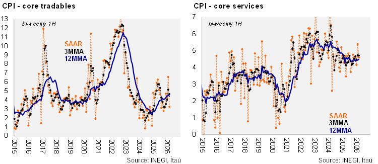 In annual terms, headline inflation was 4.63% in the first half of March, exceeding the upper bound of the inflation target’s tolerance range and marking the highest level since the second half of October 2024. Core CPI was 4.46%, with tradables at 4.43% (slightly down from 4.49%) and services at 4.49% (slightly up from 4.46%). Core measures showed marginal relief: core CPI was at 4.50% on a 3MMA SAAR basis, with tradables at 4.68% and services at 4.72%. Within services, other service categories showed a slightly better performance (5.09% vs. 5.38% in the first half of March).