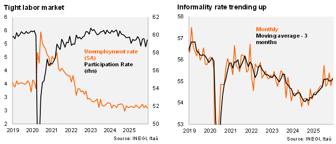 Our take: Overall, even though activity has been weak, Mexico’s labor market tightness persists, maintaining pressure on services inflation. However, despite the recent moderation, the informality rate has shown a persistent upward trend throughout 2025, which should be a source of concern regarding the creation of higher-quality jobs. Strengthening formal employment will be key to consolidating the recovery in economic activity. INEGI will publish labor market data for January on February 26.