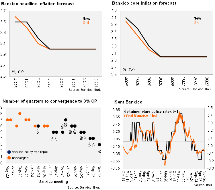 Banxico’s short-term headline and core inflation forecasts were slightly revised upward for 2026. Headline inflation is projected to be 3.5% in 2025 (down from 3.6%), while core CPI was updated to 4.1% (up from 4.0%). The expected convergence to the target remains unchanged for 3Q26. The statement noted again that the balance of risks for inflation continues to lean towards the upside, but there was a shift in the ranking of upside risks: the “persistence of core inflation” moved from risk number 3 to risk number 2 on the list.