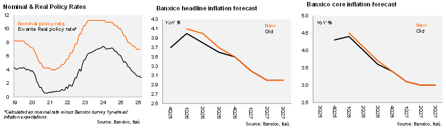 Banxico introduced upward revisions to its 1Q26 and 2Q26 inflation forecasts due to pressures from non-core inflation and persistent services inflation, while maintaining the convergence of headline inflation to the 3% target for the second quarter of 2027. The balance of risks to the inflation forecasts is now considered "biased up" from "more balanced, but still biased up" in the previous statement. Among the upside risks to inflation, they included the inflationary impact of geopolitical conflicts.