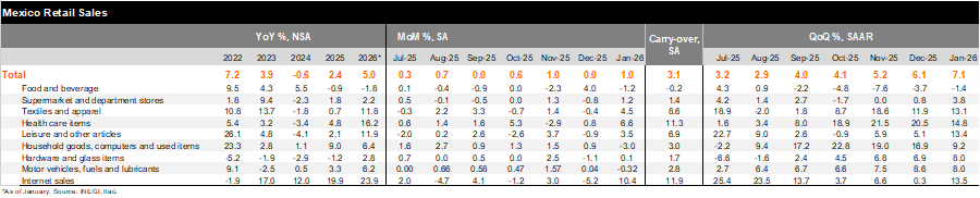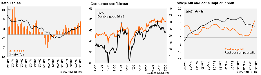 Our take: This data comes from a survey that identifies revenues from companies, which explains the difference from IGAE’s figures that consider value added. The bias of today’s release is positive: quarterly growth annualized accelerated to 7.1% up from +6.1% in the prior quarter, with a statistical carry-over of +3.1% for the year. Strong labor market dynamics and favorable credit conditions should sustain moderately positive momentum in domestic demand. Our 2026 GDP forecast is unchanged at 1.5 %.