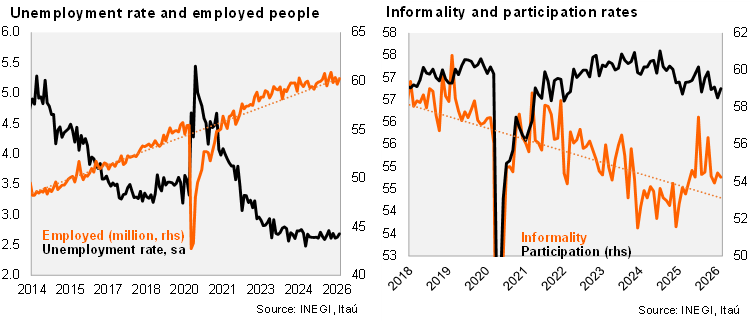 According to INEGI, the unemployment rate stood at 2.59% in non-seasonally adjusted terms in February, above Bloomberg’s market consensus of 2.50% but below January’s 2.70%. The decline was mainly driven by those unemployed for less than one month. Using seasonally adjusted data, the unemployment rate was 2.69% in February, up from 2.63% in January and from 2.63% a year ago.