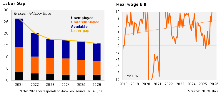 Compared to last year, the number of employed individuals increased by one million in February, largely within the informal sector. The labor participation rate stood at 59.0%, slightly higher than last year’s rate of 58.7% but still below the pre-pandemic average of 59.5%. The informality rate ticked up to 54.8% from 54.2% a year earlier, although the longer-term trend remains downward. Regarding wages, the real wage bill rose by 20.6% YoY, driven by a 12.9% YoY increase in the number of employed people and higher real wages during the month, which increased by 6.8% YoY.