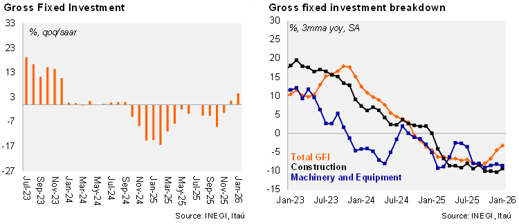 Gross Fixed Investment (GFI) decreased by 3.3% YoY in January, a steeper decline than the Bloomberg median (-2.0%). By sector, machinery and equipment decreased by 9.8%, with both imported and domestic components declining. Construction rose by 3.0% YoY, with private and residential components also increasing. Using seasonally adjusted data, investment fell by 1.1% MoM, below market expectations of -0.5%. Machinery and equipment decreased by 1.1% mainly due to transportation equipment, while construction declined by 0.8% due to both residential and non-residential components.