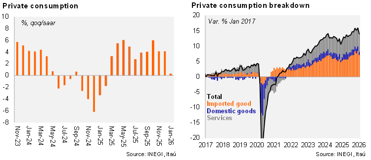 Private consumption increased by 1.5% YoY, below Bloomberg median of +3.0%. On a monthly basis, using seasonally adjusted data, private consumption declined by 1.6%, with domestic goods and services showing contractions of 0.9% and 0.5%, respectively. Imported goods drop by 6.8%, following the tax increase on imported goods from countries without trade agreements, which came into effect in January 2026.