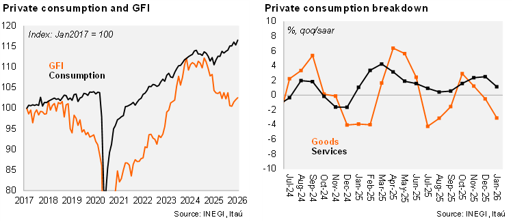 Our view: January’s domestic demand data reflected the impact of higher tariffs on imports from non-FTA countries, as well as US tariffs that have weighed on the heavy-vehicle sector. In late March, the Mexican government announced a program to incentivize heavy-vehicle purchases amid declining production and demand. While positive, we believe this measure will not be decisive in reversing the investment trend. Looking ahead, soft capital goods imports suggest private investment is likely to remain subdued. In this context, the recently announced Infrastructure Investment Plan for 2026–2030 poses an upside bias to our activity forecasts for the second half of the year. Private consumption, on the other hand, is expected to continue growing at moderate rates, supported by rising wages and the World Cup. We forecast 2026 GDP growth at 1.5% YoY.