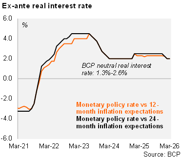 The Committee highlights that economic activity continues to expand, albeit at a slower pace due to a high comparison base. Inflation remains low, mainly driven by subdued goods inflation. Current projections indicate that annual inflation will remain temporarily below target before converging to the 3.5% objective by late 2026. External risks remain centered on international energy price developments, which may continue to affect domestic fuel prices. After today’s decision, we estimate the one‑year ex‑ante real policy rate at 2.00%, remaining within the BCP’s neutral real interest rate range (1.3%–2.6%).