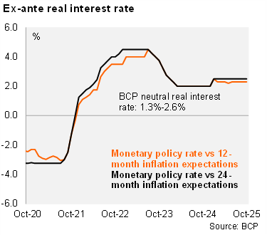 The committee reaffirmed once again its commitment to price stability and will continue to closely monitor internal and external developments, to anticipate their possible implications on the path of inflation and take appropriate measures to ensure compliance with the 3.5% target over the monetary policy horizon. Therefore, we estimate that the real ex-ante policy rate remains at 2.5% (using expectations for the monetary policy horizon), compared to the BCP’s neutral real interest rate range of 1.3%-2.6%.