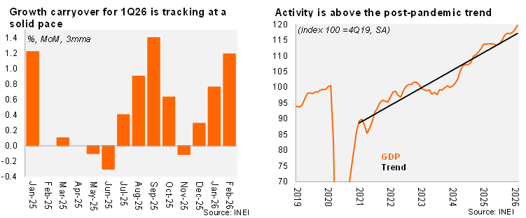 Our Take: Leading indicators such as imports of capital goods, cement consumption, and payment transactions continue to grow at a healthy clip, consistent with ongoing investment activity and resilient private consumption. That said, we expect some moderation in March activity, driven by transitory disruptions to local gas supply, which are likely to weigh on energy generation, manufacturing output, and potentially services activity. These effects should prove temporary, but may introduce short-term volatility in monthly prints. Looking ahead, our 2026 GDP growth forecast of 3.1% remains intact, though risks are skewed to the downside. Key headwinds include elevated global geopolitical uncertainty and adverse weather risks associated with a possible El Niño event, which could affect agriculture and fishing. The March economic activity report is scheduled for release on May 15.