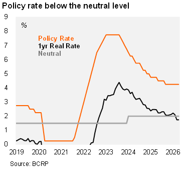Our take: Our baseline scenario points to the policy rate remaining at 4.25% in the near term, alongside a cautious policy stance. However, amid rising inflationary pressures and still‑favorable terms of trade, the balance of risks is increasingly tilted toward a potential rate hike. The next Monetary Policy Meeting is scheduled for May 14.