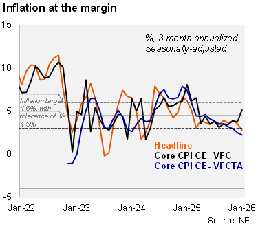 At the margin, headline and core inflation were mixed. Using our seasonally adjusted figures, the three-month annualized headline inflation fell to 2.8% in January (from 3.6% in December), while core inflation rose to 5.2% from 3.8% before. Finally, the CPI-CE VFCTA reading fell to 2.2%, from 2.5% in the previous month.