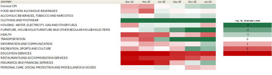 Our CPI heatmap shows that 54% of selected items are below the central bank’s target (4.5%), below the previous month (62%), and much better than January 2025 figures (38%).