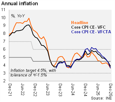 All CPI readings drifted below the Central Bank's 4.5% target, yet within the tolerance range. Headline inflation fell to 3.65% YoY in December from 4.09% in November, while the core reading decreased to 3.89% from 4.37% in the previous month. The CPI-CE VFCTA fell to 3.66% YoY, from 4.31% YoY in November.
