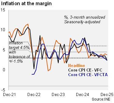 At the margin, inflation eased in December. Using our seasonally adjusted figures, the three-month annualized headline inflation fell to 3.8% in December (from 4.1% in November), while core inflation dropped to 2.5% from 3.6% before. Finally, the CPI-CE VFCTA reading fell to 2.4%, from 2.9% in the previous month.
