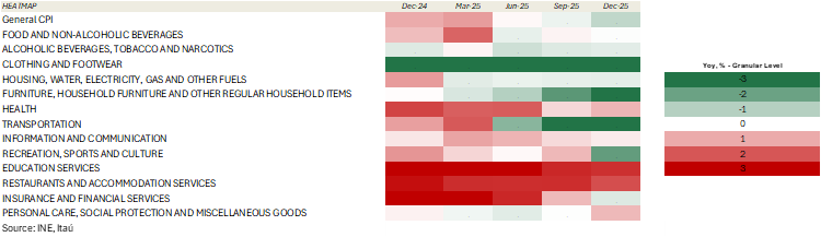 Our Take: Our inflation forecast for YE26 stands at 4.5%, in line with the central bank's target. January's CPI, which includes the reversal of the temporary seasonal discount on electricity and increases in tariffs (electricity, telephone, internet, and water services), will be released on February 4.