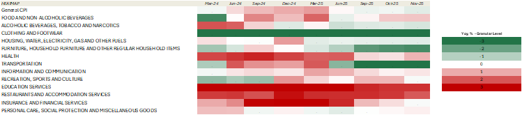 Our CPI heatmap shows that 54% of selected items are below the central bank’s target (4.5%), above the previous month (38%), and much better than December 2024 figures (15%).