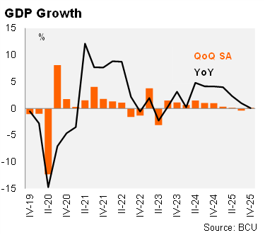 GDP grew 0.1% YoY in 4Q25, down from 1.0% YoY in 3Q25. At the margin, using the central bank’s seasonally adjusted series, GDP increased 0.1% QoQ/sa in 4Q25 – outperforming the monthly GDP proxy, which had pointed to a 0.6% QoQ/sa contraction. For the full year, GDP expanded 1.8% in 2025, below the 3.3% growth recorded in 2024.